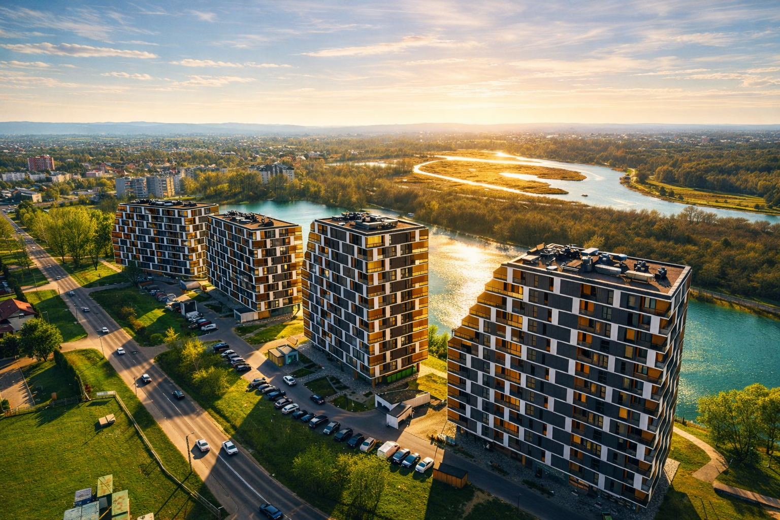 Osiedle zlokalizowane przy jednej z najbardziej atrakcyjnych ulic w Rzeszowie, przy ul. Kwiatkowskiego z bezpośrednim dostępem do jeziora.